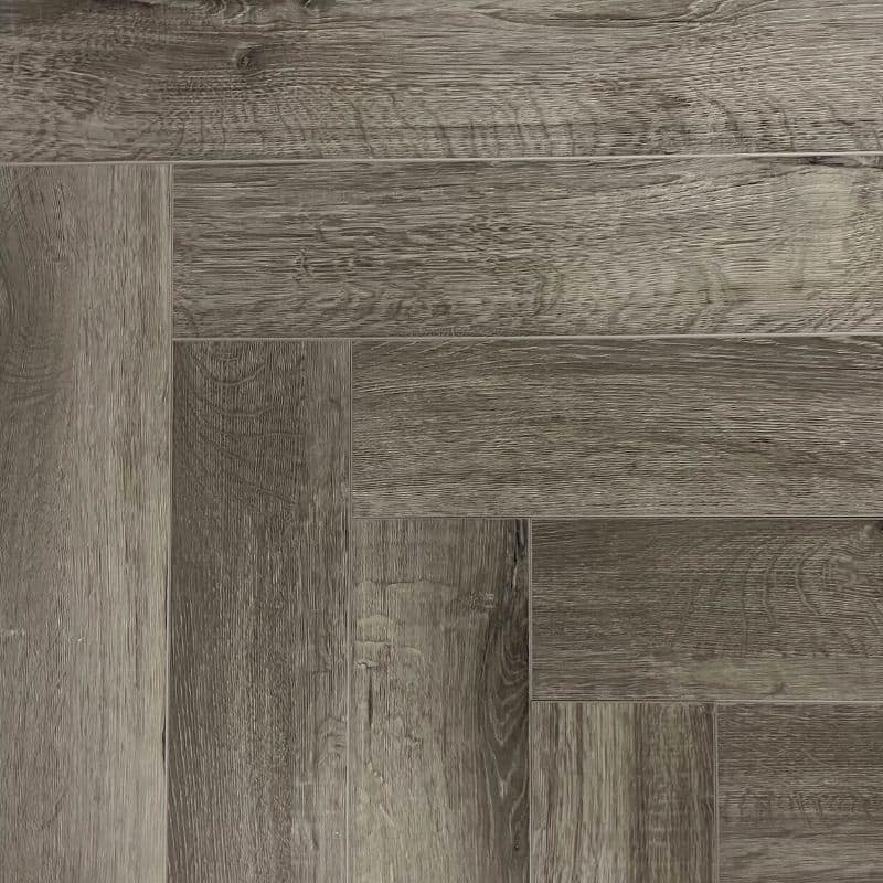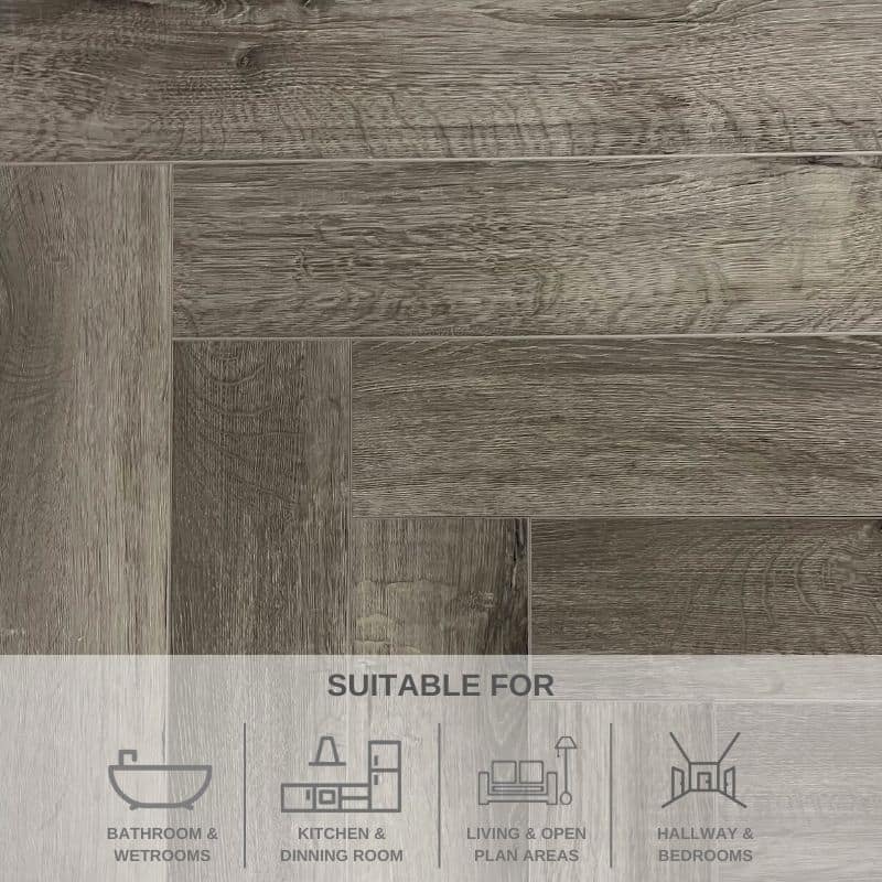 Carron Dark Grey Oak Herringbone SPC Click Flooring | This Herringbone SPC Flooring has an embossed natural look and feel with anti bacterial properties. Pet friendly and easy to clean this flooring is ideal for those high traffic areas in your home. This Herringbone flooring is a pattern style made from rectangular planks that meet at perfect straight edges to form a zigzag herringbone pattern - make your home interior stand out with this luxe style.