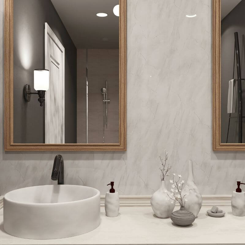 An elegant and luxurious option for interior upgrades that won't go over budget, The Panel Company's large marble effect PVC shower panels come in a subtle grey marble colourway that is perfect for contemporary bathrooms. Whether you're looking to complete a new shower area with marble effect shower panels or are taking the plunge with a full bathroom cladding upgrade, this subtle grey marble design scheme is a beautiful choice.