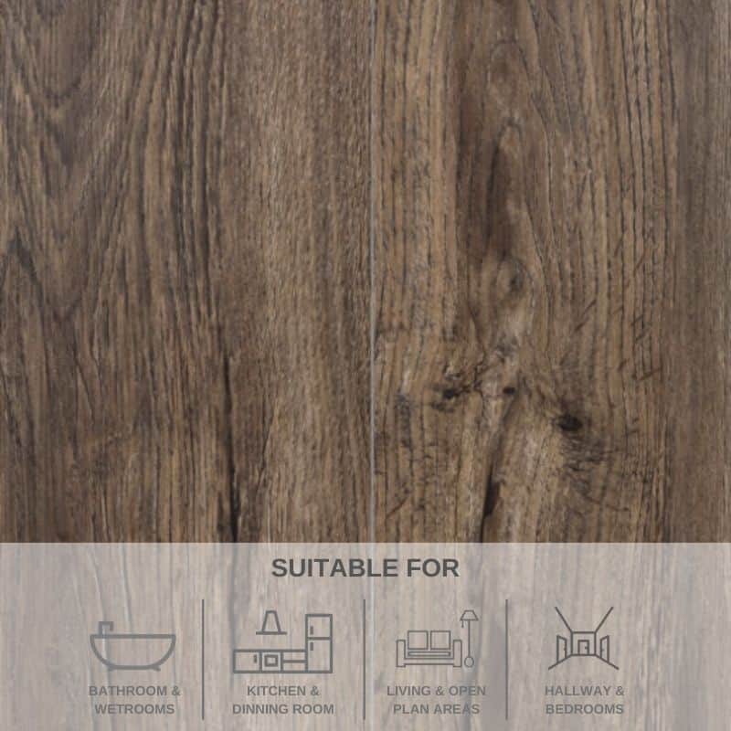 Kilconcuhar Oak SPC Luxury Vinyl Click Flooring | This dark oak SPC flooring has an embossed natural look and feel with anti bacterial properties. Pet friendly and easy to clean this flooring is ideal for those high traffic areas in your home.