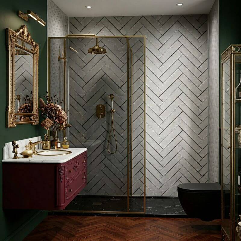 This grey herringbone tile effect shower panel has a grey tile high definition print consisting of a grey matt rectangular tile, with a dark grey grout which gives an authentic look.