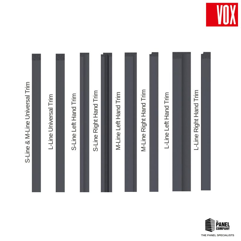 Anthracite Linerio Slat Wall Panel Vox Finishing Trims - Available in a Universal Fit, Left Hand & Right Hand in Anthracite. For finishing off the Linerio anthracite slat panel on the top and bottom & both sides - shop the Vox Linerio S-Line Anthracite Slat Panel Now >