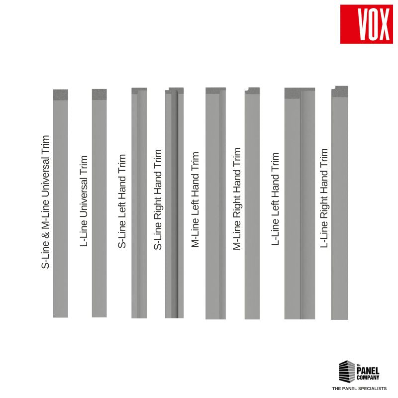Grey Linerio Slat Wall Panel Vox Finishing Trims - Available in a Universal Fit, Left Hand & Right Hand in Grey. For finishing off the Linerio Grey slat panel on the top and bottom & both sides - shop the Vox Linerio S-Line Grey Slat Panel Now >